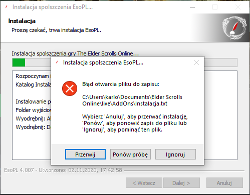| Description | Jak w tytule mam problem z instalatorem spolszczenia. Podczas instalacji wyskakuje mi takie okienko jak na screenshocie, po kliknięciu "Ponów próbę" wyskakuje mi to samo okienko z tym samym plikiem (to samo dzieje się przy innych jeśli kliknę "Ingoruj"). Próbowałem przejść przez instalację klikając tylko w "Ignoruj" i się udało, ale spolszczenie kompletnie nie działało. Proszę o pomoc, dziękuję i pozdrawiam. | ||||